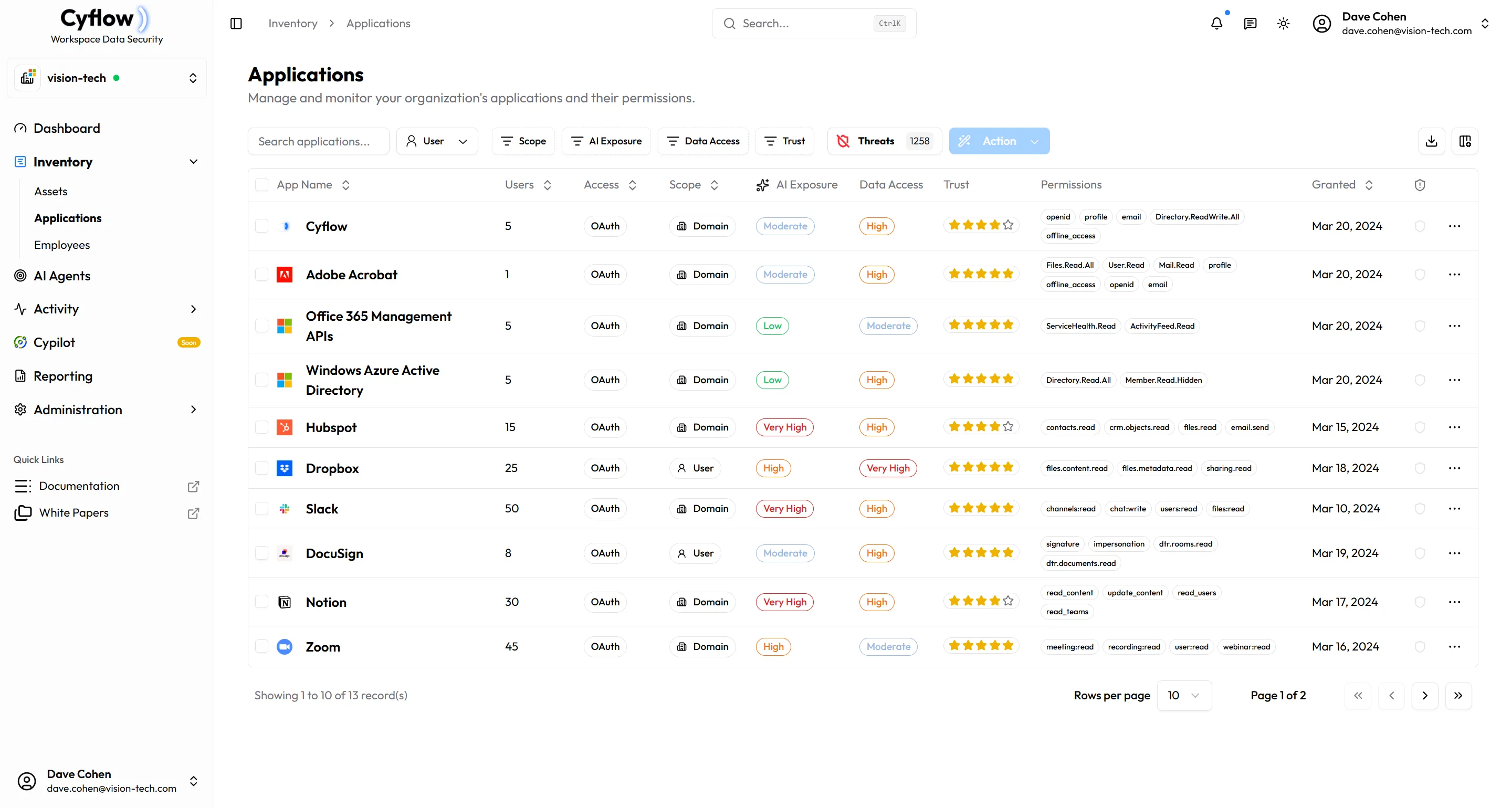 See exactly what data each app can access—emails, files, calendar, contacts—and admin consent status.